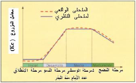 كما نلاحظ في الرسم السابق فإن معامل المزروع يبتدأ ضعيفاً ثم يزيد موازاة مع تغطية المزروعات للأرض، ويصل المعامل إلى حده الأقصى في مرحلة الإزهار، ويظل مرتفعا خلال المرحلة الوسطى ثم يأخذ في الانخفاض في مرحلة النضج. ومن المستحسن أن نحدد قيم المعامل لكل مزروع في البقعة المختارة لمختلف مراحل الزرع، وفي حالة غياب هذه المعطيات يمكن استعمال قيم توجيهية للمعامل الزراعي لمختلف الأنواع العشبية والخضرية تمدنا بها المصالح الفلاحية.