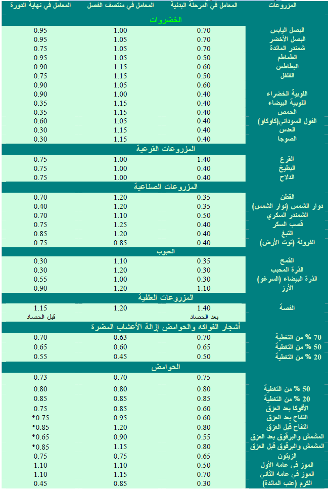 أما بالنسبة للمزروعات الشجرية الدائمة فإن معامل المزروعات يكون مقسما حسب الشهور وحسب نسبة تغطية الأرض أي نسبة ما تغطيه كتلة الأشجار من الأرض.