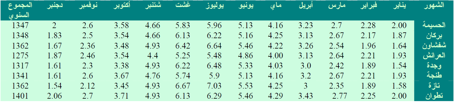 التبخر النتحي النسبي (مليميترات / اليوم) في أهم مناطق شمال المغرب محتسبة وفقا لمعادلة بلاني– كريدل (Blaney-Cridle)