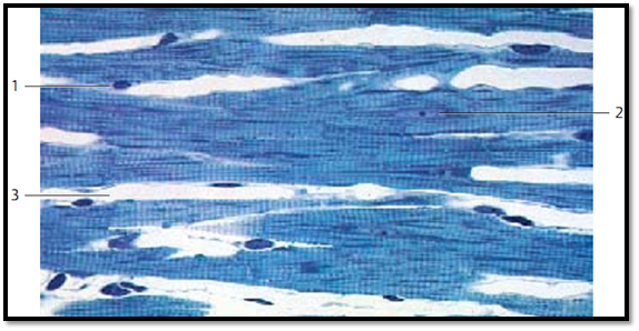 Like the skeletal musculature, the heart muscle tissue is striated. In contrast to skeletal muscles, cardiac muscle f ibers are branched and anastomose with each other, thus creating a network . The slit-shaped spaces in this web are filled with richly vascularize d connective tissue. Cardiac muscle f ibers are thinner than skeletal muscle fibers but thicker than smooth muscle cells. This figure clearly shows the capillaries 3 in the web spacing. The heavily stained nuclei are part of f ibrocytes 1 . Heart muscle cells ( cardiomyocytes ) have only one nucleus. Characteristic of cardiomyocytes are struts (disci in-tercalares ), which are dense, heavily stained bands across the muscle fibers. They are regularly spaced and cover the entire width of the fiber. Electron microscopic investigations have shown that struts are co-localize d with part of the cell borders. The faintly stained nuclei 2 occupy the center of the cardiac muscle cells. There are no fibrils in the perinuclear space. Instead, a rich layer of sarcoplasm surrounds the nuclei. In the sarcoplasmic cones are of ten fat droplets, glycogen and pigment granules (brown age pigment).