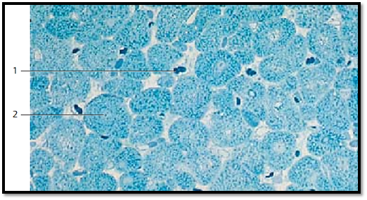 Cross-sections through cardiac muscle cells show the faintly stained central nuclei 2 and the Cohnheim fields or groups. The latter are base d on the formation of fibril bundles from myofibrils ( myofibril fields). The spaces between them contain sarcoplasm. Numerous capillaries 1 , which often still contain erythrocytes, are found in the loose connective tissue between muscle cells.