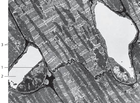 Section from a longitudinally cut cardiac muscle cell with central nucleus 1. The sarcomeres of the “cardiac muscle f ibers” have in principle the same striation pattern as the striate d skeletal muscle f ibers. However, in cardiac muscle sarcomeres are not arranged strictly parallel in separate columns, but form a branched three-dimensional web (cf. Figs. 238, 240). Note the mitochondria 2 , which are arrange d in columns between the microfilament bundles. In the nuclear cones are the sarcoplasm, mitochondria and, in numbers that increase with age, granules with the wear-and-tear pigment lipofuscin. In the lower right is a capillary 3 .