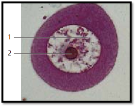 Oocyte from a sea urchin ovary. Large, heavily stained nucleolus 2 inside a loosely structured nucleus 1 . The finely granulated cytoplasm contains yolk materials. Cell organelles are not visible.