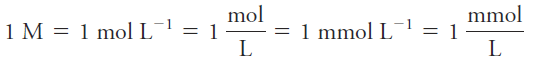 The unit of molar concentration is molar, symbolized by M, which has the dimensions of mol/L, or mol.L-1. Molar concentration is also the number of millimoles of solute per milliliter of solution.