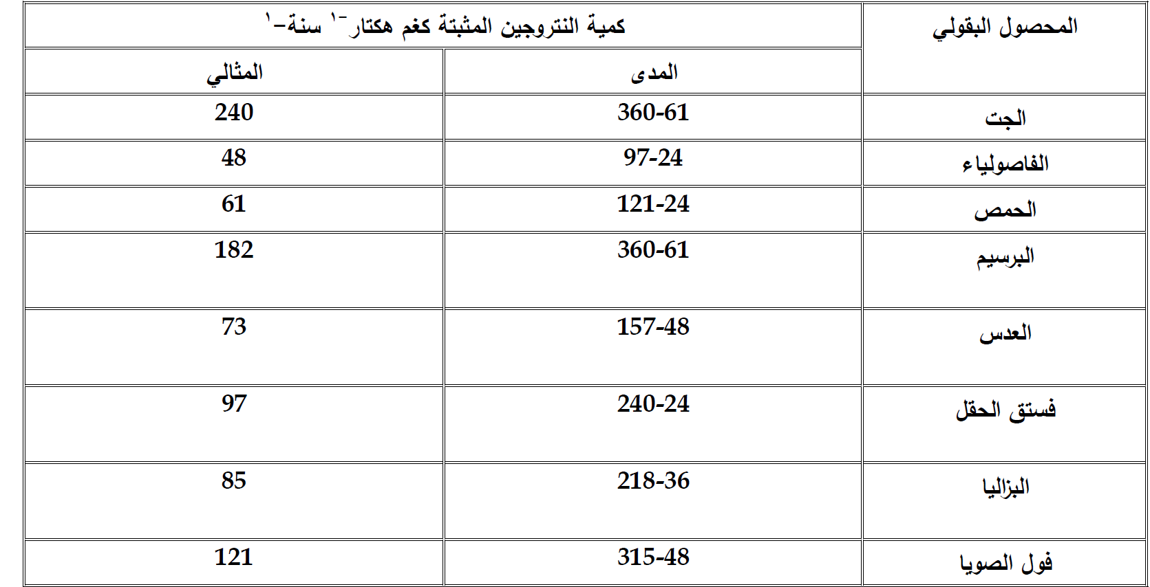 والجدول 1 يبين الكميات من النتروجين التي من الممكن ان تثبت من قبل هذه الاحياء وهذه الكميات تختلف حسب المناخات المختلفة وهنا للمناطق المعتدلة: