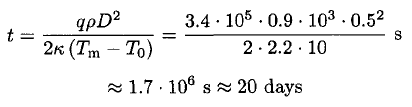 Estimate how long it will take for a small pond of average depth D = 0.5 m to freeze completely in a very cold winter, when the temperature is always below the freezing point of water (see Figure 1.1). Take the thermal conductivity of ice to be κ = 2.2 W/m K, the latent heat of fusion q = 3.4 × 105 J/kg, and the density ρ = 0.9 × 103 kg/m3. Take the outside temperature to be a constant T0 ~ 263 K.