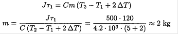 An immersion heater of power J = 500 W is used to heat water in a bowl. After 2 minutes, the temperature increases from T1 = 85oC to T2 = 90°C. The heater is then switched off for an additional minute, and the temperature drops by ∆T = 1oC. Estimate the mass of the water in the bowl. The thermal capacity of water c = 4.2 × 103 J/kg K.