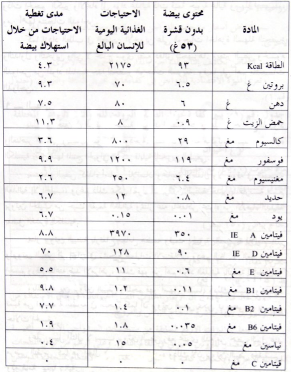 جدول رقم (2): يبين محتوى المواد الغذائية في بيضة الدجاج ومدى مساهمتها في تغطية احتياجات الانسان اليومية.