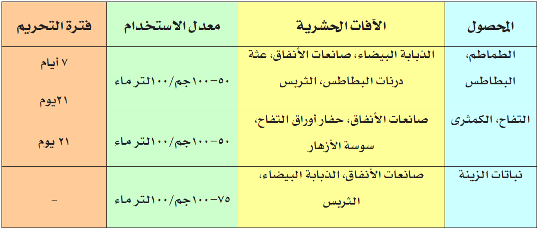 - لا يسمح برعي الماشية في المناطق المعاملة أو تقديم العلف المعامل قبل مرور 12 يوم على الرش.