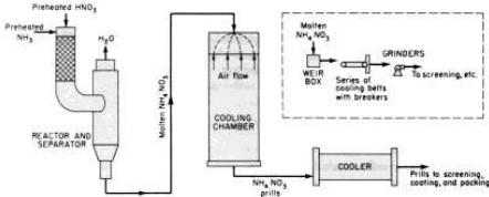 فاذا جرى توزيع متناسب وتسخين مسبق كما ينبغي ، فقد يستمر التفاعل لينتج نترات امونيوم مصهورة تحتوي على نسبة ضئيلة من الماء ( ١ - 5 %) يمكن تشكيلها الى كرات صغيرة (حبيبات) عن طريق رش dropping ناتج التفاعل عبر برج للرش shot tower ، او الى قشيرات عن طريق تبريدها فوق احزمة او اسطوانات. ويمكن الحصول على مادة حبيبية جافة كناتج عن طريق معالجة السرير المسيل (المعجج) . واستخدمت ايضا الطرق المتقطعة، ولكن كلفة العمل والمعدات كانت تعوق استخدامها . وتمثل الصورة 1 - 1 مخططا نموذجيا للإنتاج .