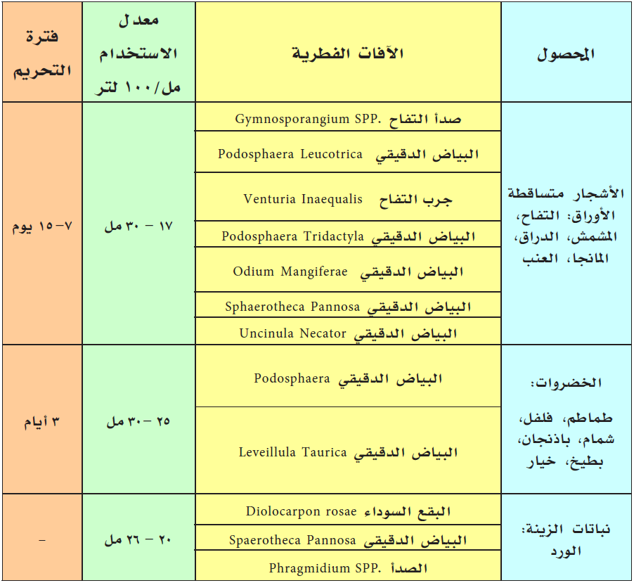 مبيد فطري جهازي يعمل بشكل وقائي وعلاجي في مكافحة جرب التفاح والبياض الدقيقي وتبقعات الثمار في الأشجار متساقطة الأوراق والعنب والفراولة والخضار.