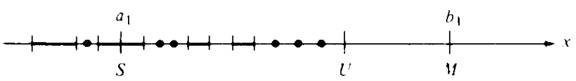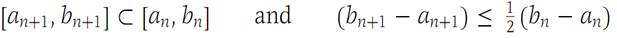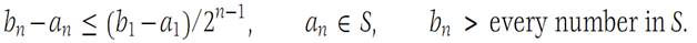 If M ∈ S, then we may take U= M, since in this case every x in S is less than or equal to U, and if U/<U, then U/is not an upper bound, since U ∈ S and U>U/.If M is not in S, let b1 =M and choose a1 as any point of S. Now, either (a1 + b1)/2 is greater than every x in S, or there is some x in S greater than or equal to (a1 + b1)/2. In the first case, if we define a2 = a1 and b2 = (a1 + b1)/2, then a2 ∈ S and b2 is greater than every x in S. In the second case, choose for a2 one of the numbers in S that is greater than or equal to (a1 + b1)/2 and set b2 = b1; then we again have a2 ∈ S and b2 greater than every x in S. Continuing in this way, we define an infinite sequence {[an,bn]} of closed intervals such that(1.2)