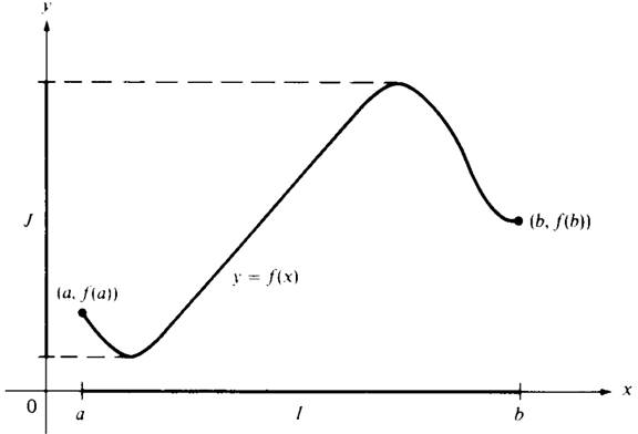 If f is continuous on I ={x : a ≤ x ≤ b}, it is not necessarily the case that J is determined by f(a) and f(b). Figure 1.4 shows that J may exceed the interval [f(a), f(b)]. In fact, I may be bounded and J unbounded, as is illustrated by the function f : x → 1/x with I ={x :0 <x< 1}.The range is J ={y :1 <y< ∞}. The function f : x → 1/(1 + x2) with I ={x :0 <x< ∞} and J ={y :0 <y< 1} is an example of a continuous function with an unbounded domain and a bounded range.