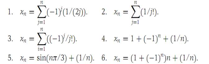 In each of Problems 1 through 6 decide whether or not the infinite sequence is a Cauchy sequence. If it is not a Cauchy sequence, find at least one subsequence that is a Cauchy sequence. In each case n = 1, 2,....