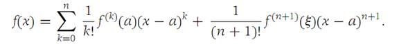 Suppose that f :R1 to R1 and all derivatives of f up to and including order n+1 are continuous on an interval I ={x:|x − a| <r}. Then for each x on I, there is a number ξ in the open interval between a and x such that(1.6)