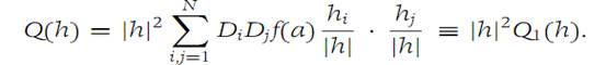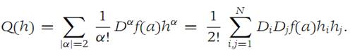 where ξ is on the straight line segment connecting a with a + h. Since f has a critical point at a, the first sum in Equation (1.11) is zero, and the second sum may be written (1.12)