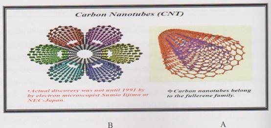 B = لم يحدث الاكتشاف الفعلي للأنابيب النانوية الكاربونية الا في عام 1991 من قبل الباحث سومو ايجما Sumio Ihjhima من NEC اليابان .