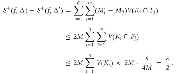 the common refinement of Δ1 and Δ0. Because of the manner in which we chose Δ, each Ji is contained entirely in some F(0)k . Therefore, J1,J2,...,Jn are domains in the refinement Δ/ . The remaining domains of Δ/ are composed of the sets Ki ∩ Fj , i = 1, 2,...,q; j = 1, 2,...,m. We have the inequality