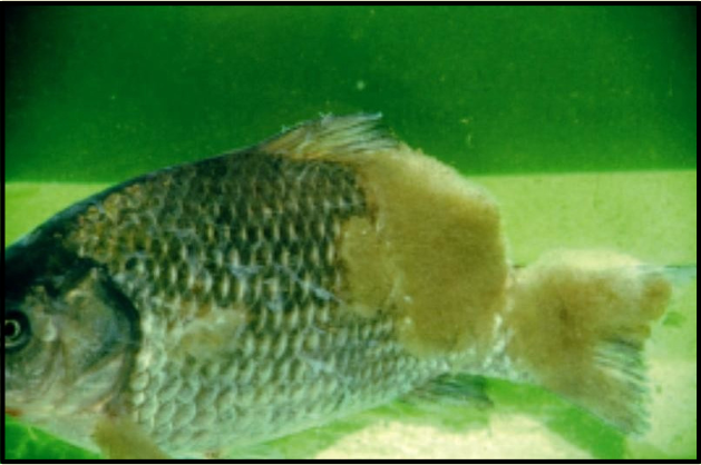 ظهور نموات قطنية على السطح الخارجي للأسماك أو البيض وقد تكون بيضاء، رمادية، بنية، خضراء وذلك حسب نوع الطحالب السامة. وترى بهذه الصورة الواضحة وهى بالماء وبعد خروج الأسماك من الماء يختفى هذا الشكل وتظهر ايضا تقرحات سطحية أو عميقة حسب حالة المرض.
