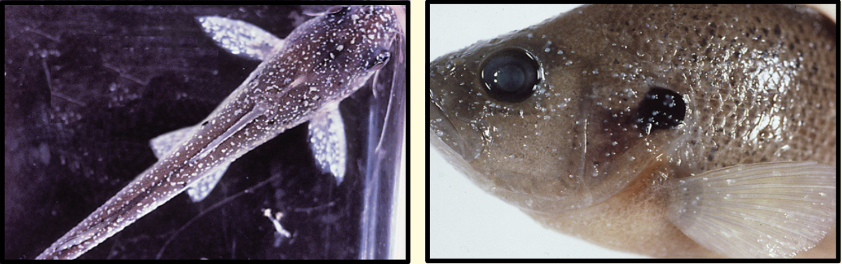 هذه الديدان عبارة عن ديدان رفيعة جدا تلتصق بجسم السمكة (على الجلد والزعانف) وتتغذى على دمائها وأحيانا تلتصق بالخياشيم وتظهر السمكة هزيلة وبطيئة في حركاتها. وهذه الإصابة تظهر أكثر في الأحواض التي يطعم فيها في السمك بالدود الحى أو مع دخول سمك جديد بالحوض.