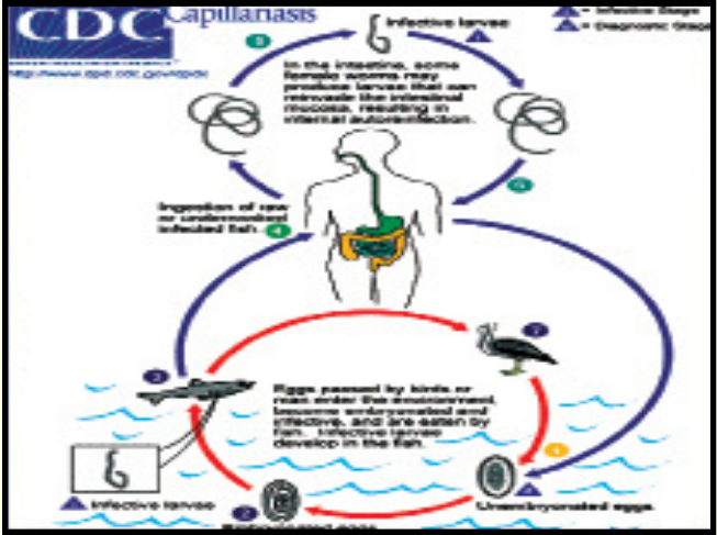 - هذه اليرقات تصيب أسماك المياه العذبة وتنتشر في التجويف البطني والأعضاء والعضلات