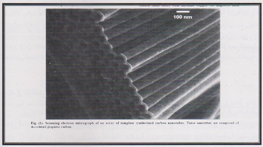 (الشكل) :مقطع مصور بالمجهر الإلكتروني الماسح لمصفوفة (array) لأنابيب صغروية " كاربونية للطبعة المخلقة بالطبعة synthesized template ، تتكون هذه الانابيب من الكاربون الكرافيتي .