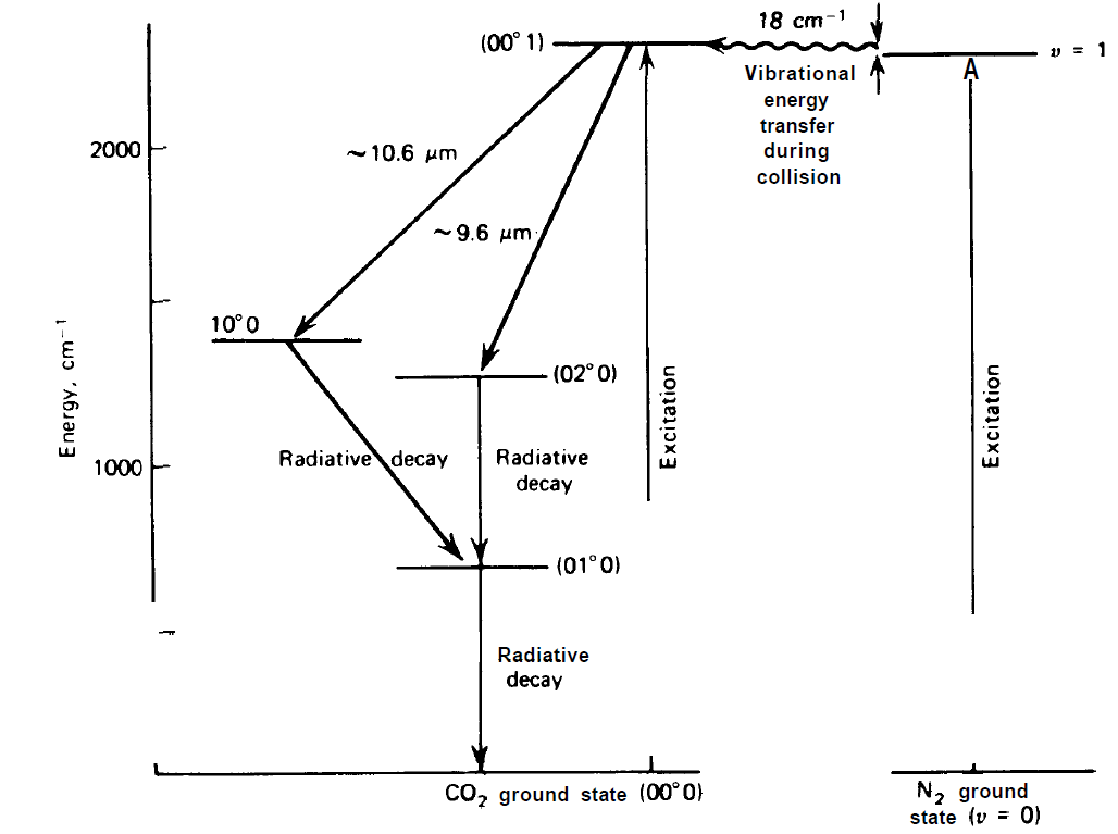 The most important example is provided by the CO2 gas laser. In these molecules the individual atoms can perform oscillations. The three fundamental kinds of oscillations are shown in fig. 1.1. According to quantum theory the different kinds of oscillations must be quantized so that discrete energy levels result. The energy level diagram belonging to some low lying oscillation levels of CO2 is represented in fig. 1.2. One of the laser processes rests on the optical transition between the levels which are denoted in fig. 1.2 by 00'1 and 10'0. The excitation of the uppermost level is usually achieved in a plasma discharge in which N2 and He participate in addition to CO2. In the plasma discharge a large fraction of the two-atomic N2 molecules is excited to make vibrations, whereby the molecules accumulate in the excited state with the vibration quantum number n = 1 of the harmonic oscillator. Collisions with CO2 molecules in their ground states make a transfer of the energy from the excited state of N2 to an excited state of CO2 possible. The remaining small energy difference is transformed into kinetic energy of the molecules after their collisions. The efficiency of CO2 lasers is very high and lies at about 30%. In order to achieve high power emission, lasers with a length up to several hundred meters have been built. According to quantum theory, besides the vibrational levels of CO2 molecules also discrete rotational levels are possible which may also participate in the laser process. If the gas pressure is increased above 5 Torr, due to the numerous collisions a line-broadening occurs which exceeds the usual