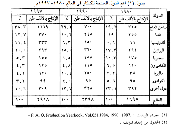 ويلاحظ من الجدول التزايد الكبير في انتاج ساحل العاج التي احتلت المركز الأول منذ عام 1980م بعد ان كانت في المركز الرابع في عام 1970م حيث تزايد انتاجها بشكل ملحوظ في السنوات الأخيرة، اما البرازيل فقد تزايد انتاجها واحتلت المركز الثاني بعد ان كانت في المركز الثالث في عام 1970م.