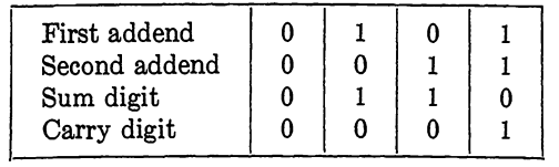 In combining two digits in any radix, whenever the sum exceeds or equals the radix, it is necessary to "carry" a digit into the next position to the left. This means that in adding two numbers of several digits, there will be times when in a given position we will actually need to add three digits. In fact, except for the rightmost digit, this will always be the case since we will always consider a carry digit which may be either 0 or 1 in the binary system. Because of this carry, it is convenient to perform additions in two steps. The first step will be performed by a new logical circuit element which we will term a half adder. The half adder will be a device capable of performing the operation indicated by Table 1-1. That