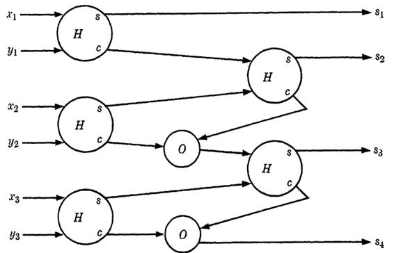 X = x3x2x1 and Y = y3y2y1, where each x1 and y; is either 0 or 1. These digits are supplied in pairs to half adders as shown in Fig. 1-3. The sum (answer) is the number 84838281i given by the four outputs. That this circuit will work is self-evident. After the first position, the circuit is the same for each higher position. Two inputs, say x2 and y2, are combined in a half adder, with the sum going to a second half adder to be combined with a carry from position 1. The sum of half adder 2 is the second digit of the answer, and the carry from the two half adders are combined with an "or" element to give the carry for the next higher position. Note that these two half adders cannot both yield a carry signal, since if the first showed 1 as a carry it must have 0 as a sum and hence the second half adder cannot also have a carry. If more than three digits are being added, the bottom output becomes the carry to the fourth position rather than the fourth digit of the answer.