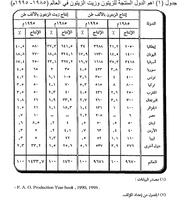 ان منطقة حوض البحر المتوسط هي منطقة الإنتاج الرئيسية للزيتون كما يبدو من (جدول 1) حيث نرى ان إيطاليا واليونان تنتجان نحو 60 % من انتاج العالم من زيت الزيتون واذا اضفنا اليهما اسبانيا فان انتاج الدول الثلاث من الزيتون 75 % من انتاج العالم عام 1995م. واذا اضفنا بقية الدول المنتجة للزيتون في منطقة البحر المتوسط مثل: تونس وتركيا وسوريا والبرتغال ولبنان والمغرب والجزائر ومصر فان انتاج هذه الدول يتجاوز 95 % من انتاج زيت الزيتون في العالم، وبذلك يعتبر الزيتون حكرا على دول البحر المتوسط.