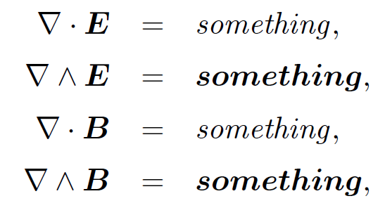 Let us now embark on a slight mathematical digression. Up to now we have only studied the electric and magnetic fields generated by stationary charges and steady currents. We have found that these fields are describable in terms of four field equations: