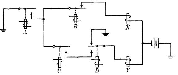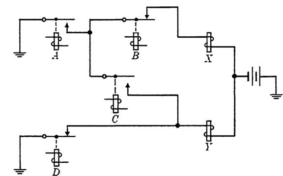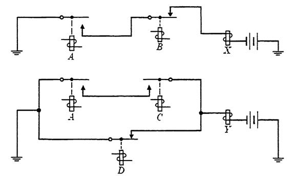 EXAMPLE 1. Two relays X and Y are to be controlled from contacts on relays A, B, C, and D representing input conditions. We are to design a control circuit such that X will be operated when A is operated and B is released, and Y will be operated if both A and C are operated or if D is released.