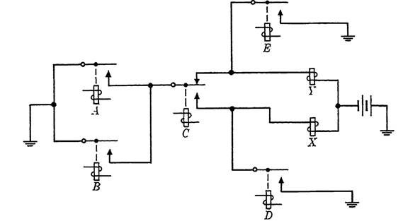 This example illustrated a situation in which two control paths can be combined without interfering with each other. (This may happen in any of several sets of circumstances, some of which are listed below.) In this case, the combination is possible because the two leads to ground for relay Y consist of disjunctive paths. We will say that two paths are disjunctive if each path passes through a contact on a common relay, one using a make and the second a break contact. In terms of the functions representing the circuits, this condition is equivalent to the condition that two functions contain respectively the factors a and a' for some relay A. In such cases a transfer contact will usually be used because it requires one less spring and ensures that the two paths cannot be simultaneously closed. With separate make and break contacts, it is possible that the circuits would be simultaneously closed for a short time due to contact stagger, allowing the make to close before the break opens.