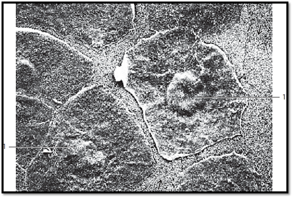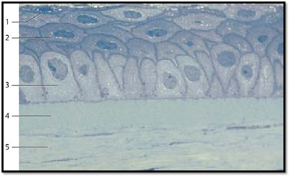 This vertical section of the cornea shows the corneal epithelium , Bowman’s membrane and the corneal stroma. Note the different shapes of the basal cells 3 and compare them with those in Fig. above. An intermediary cell of ten spans over two basal cells like an umbrella. The two uppermost layers consist of flattened, about 5 μm thick and up to 50 μm long flat surface cells 1. The anterior limiting lamina (Bowman’s membrane ) 4 lies under the epithelium. The lower part of the figure shows the corneal stroma 5 with long spindle-shape d f ibrocytes (keratinocytes ).