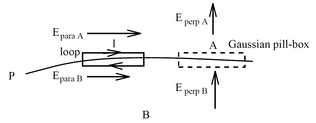 over a Gaussian pill-box S of cross-sectional area A whose two ends are locally parallel to the interface. The ends of the box can be made arbitrarily close together. In this limit, the flux of the electric field out of the sides of the box is obviously negligible. The only contribution to the flux comes from the two ends. In fact