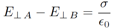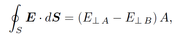 where E┴A is the perpendicular (to the interface) electric field in medium A at the interface, etc. The charge enclosed by the pill-box is simply σ A, where σ is the sheet charge density on the interface. Note that any volume distribution of charge gives rise to a negligible contribution to the right-hand side of the above equation in the limit where the two ends of the pill-box are very closely spaced. Thus, Gauss' law yields