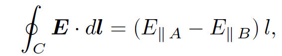 at the interface; i.e., the presence of a charge sheet on an interface causes a discontinuity in the perpendicular component of the electric field. What about the parallel electric field? Let us integrate Faraday's law,