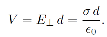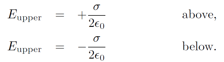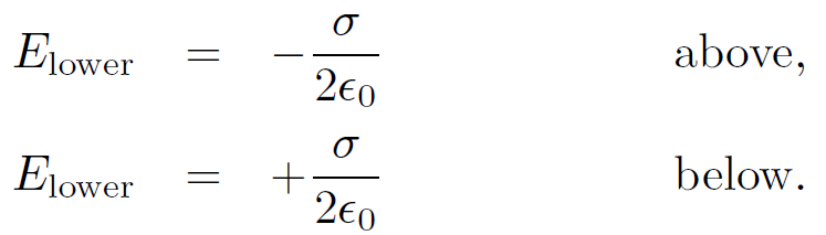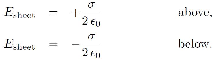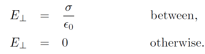Note that we are neglecting any ''leakage" of the field at the edges of the plates. This is reasonable if the plates are closely spaced. The total field is the sum of the two fields generated by the upper and lower plates. Thus, the net field is normal to the plates and of magnitude