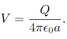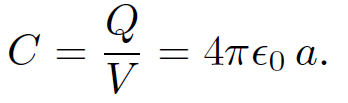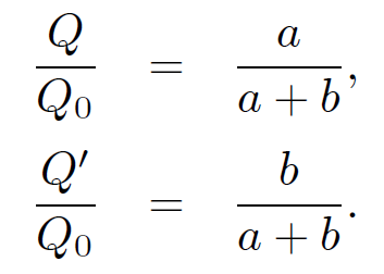 The energy of a sphere when it carries a charge Q is again given by (1/2)CV2. It can easily be demonstrated that this is really the energy contained in the electric field around the sphere. Suppose that we have two spheres of radii a and b, respectively, which are connected by an electric wire. The wire allows charge to move back and forth between the spheres until they reach the same potential (with respect to infinity). Let Q be the charge on the first sphere and Qʹ the charge on the second sphere. Of course, the total charge Q0 = Q+Qʹ carried by the two spheres is a conserved quantity. It follows from Eq. (1.12) that