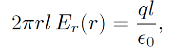 , by symmetry (adopting standard cylindrical polar coordinates). Let us integrate Gauss' law over a cylinder of radius r, co-axial with the conductors, and of length l. For a < r < b we find that