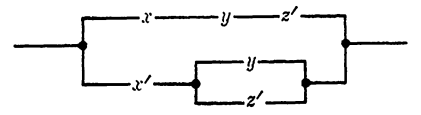 Solution. This expression indicates a series connection of .r, y, and z' in parallel with a circuit corresponding to x'(y + z'). This latter circuit consists of x' in series with a parallel connection of y and z'. Hence the circuit diagram is that shown in Fig. 1-3.