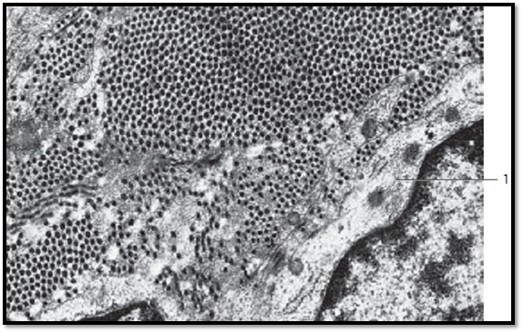 Collagen fibrils organize in the organism to collagen fibers. Their organization and distribution vary and adjust to changing tensile forces. The width of the fibril bundles varies too. In this figure, a fibril bundle (fiber) is cut vertical to its axis. A fibroblast is also cut and shows a nucleus, which is surrounded by a small plasma seam 1 . Notice the fine intracellular filaments. In the finely granulate d intercellular substance adjacent to the Fibrocyte are collagen fibrils, either singly or in small groups. They are mostly cut across their axis. Some fibrils in the lower third of the figure are cut tangentially. Section through the mitral valve of a human heart.