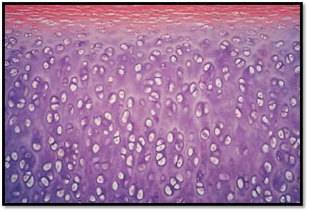 Mature hyaline cartilage tissue contains cartilage cells amid intercellular substances with different staining attributes—i.e., the interterritorial extracellular matrix. The cartilage cells occur as single cells or as groups, called chondrons or territories. The spotted staining of the interterritorial extracellular matrix ( interterritories) is due to different stacking densities of the collagen fibers and pronounced differences in glycosaminoglycan concentrations in the cartilage matrix. Glycosaminoglycans are considered responsible for the masking of collagen fibrils. At the upper edge of the figure is a thick layer of connective tissue, the perichondrium. Starting at the perichondrium, cartilage grows by apposition.
