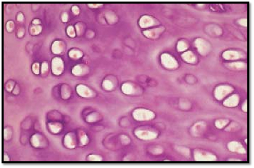 This figure shows a detail from Fig. above at higher magnification. There is a clear organization into territories and interterritories. A particularly basophilic layer surrounds the chondrocytes or the isogenous groups—i.e., cells that have all arisen from one mother cell. This basophilic layer represents the cartilage capsule. It contains only few collagen fibrils, however, it is rich in chondroitin-4-sulfate, chondroitin-6-sulfate and keratan sulfate . These proteoglycans are responsible for the strong basophilia. The basophilia extends to the immediate vicinity of the cartilage capsule or cell, thus creating small coronas around the cell groups, sometimes called cartilage coronas or territorial matrix. The interterritories—i.e., the interterritorial matrix show much less intense staining.