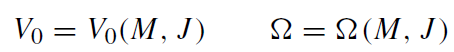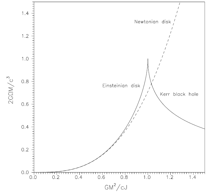 which connect the disk parameters V0 and Ω with the far-field parameters (energy mass) M and angular momentum J [23]. Figure 1.1 combines the parameter relations between ΩM and M2/J for the classical Maclaurin disk (broken curve), the general-relativistic disk, and the Kerr black hole. It indicates a phase transition from the disk to the extreme Kerr black hole at M2/J = 1 and 2ΩM = 1. This