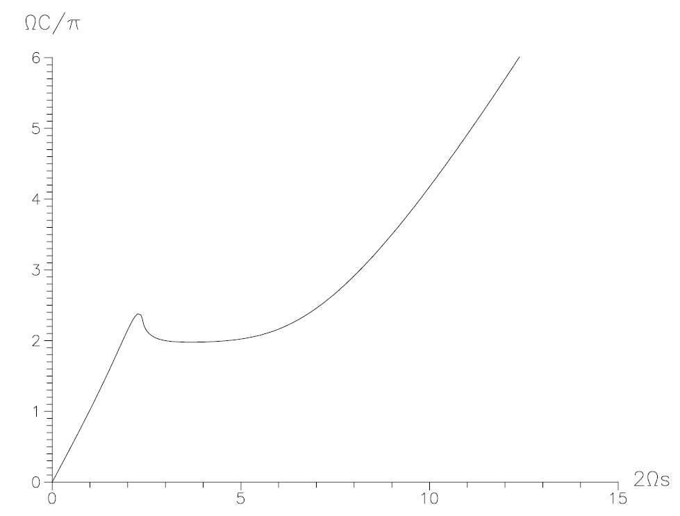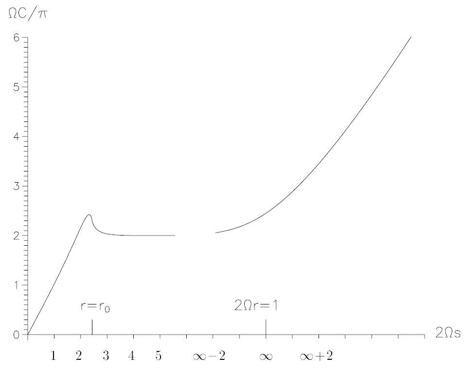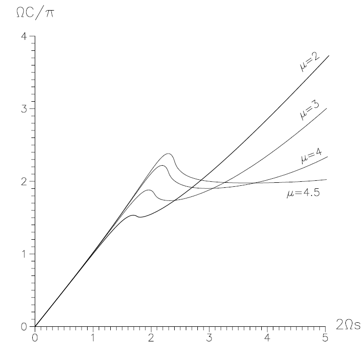 Figure 1.2. Geometry in the disk plane. The circumferential diameter C/π of a circle around the centre of the disk versus the real distances from the centre for increasing values of μ (here ΩC/π and Ωs are dimensionless quantities, c = 1) are depicted.