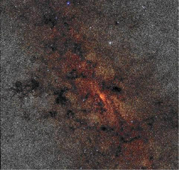 Figure 1.1. Three-color, NIR image of the central 330 pc of the Galaxy, from the 2MASS Two Micron All-Sky Survey (2MASS). The Galactic plane runs through this image at a position angle of about 30o. (2MASS is a joint project of the University of Massachusetts and the Infrared Processing and Analysis Center/California Institute of Technology, funded by the National Aeronautics and Space Administration and the National Science Foundation.) See also color section.