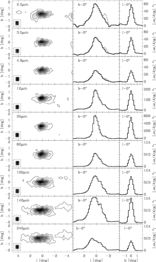Figure 1.2. Surface brightness maps of the Nuclear Bulge, at nine wavelengths between 2.2 and 240 μm, as measured by the COBE satellite (from Launhardt et al 2002). These images are corrected for both emission and foreground extinction by dust in the Galactic Disk, and the emission from the much more extended Galactic Bulge has been subtracted. Lowest contour levels are at 10% of the maximum in the NIR maps and 5% in all other maps. Small boxes in the lower left of the maps show the DIRBE beam (HPBW = 0.7o) at the corresponding wavelength bands. The middle and right-hand panels show the corresponding longitude and latitude profiles at b = 0o and l = 0o, respectively.