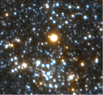 Figure 1.3. Two-color (H: 1.65 μm and K' : 2.1 μm) image of the center of the Nuclear Bulge, showing a region 18 arcsc on a side (0.75 pc for a Galactic Center distance of 8 kpc). These data were acquired with the QUIRC camera behind the Hokupa'a adaptive optics system as part of the Demonstration Science Program of the Gemini North Telescope. See also color section.